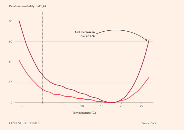 What temperature becomes dangerous for the elderly? Both extremes: -3C has the same mortality risk as 27C. The safest is right in the middle, at 17C.